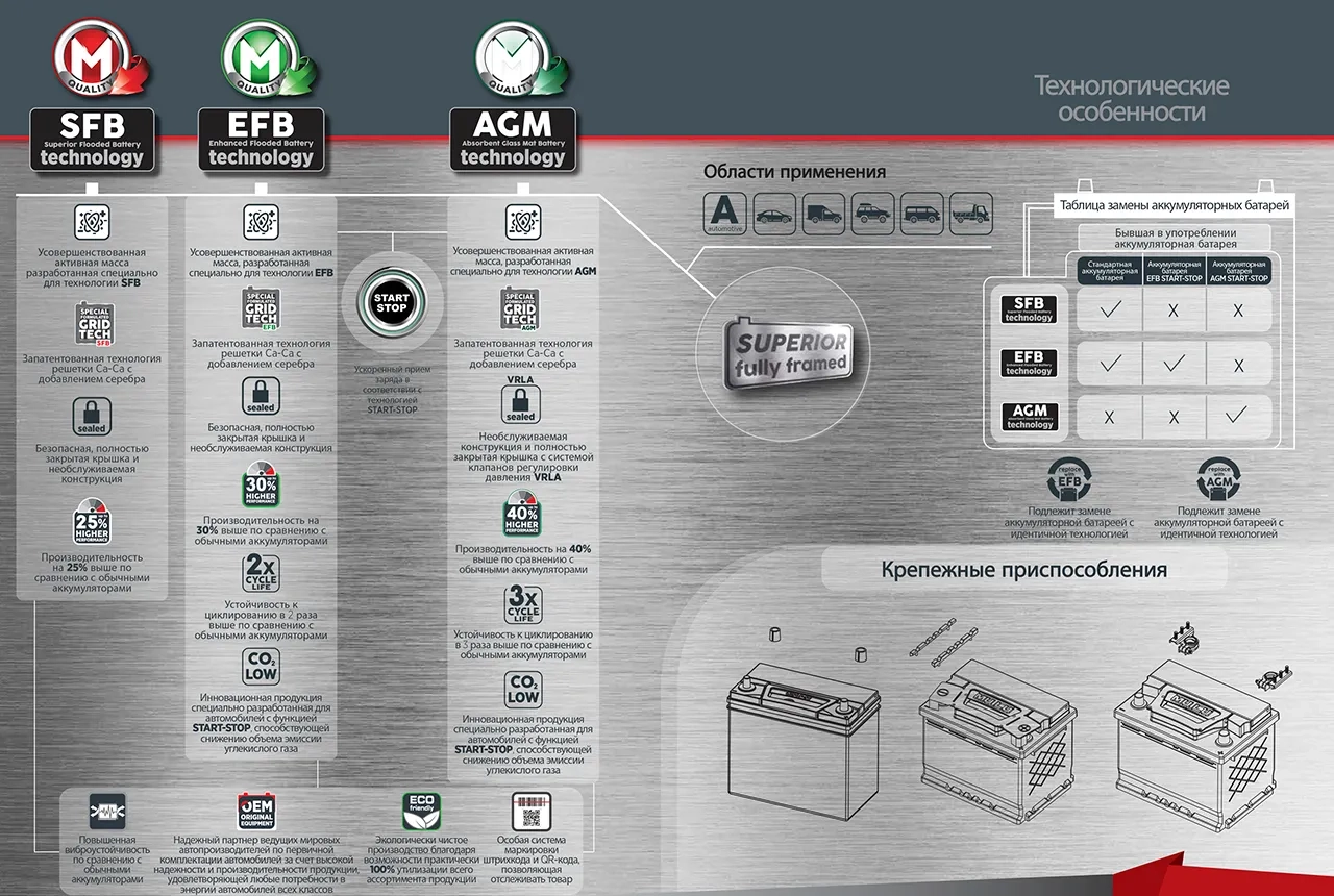 Такие автономные источники питания обеспечивают большую производительность за счет применения абсорбированного электролита. Предназначены для машин с высоким уровнем энергопотребления. На отечественном рынке представлены батареи емкостью 60–105 А·ч с пусковым током от 680 до 950 А соответственно.