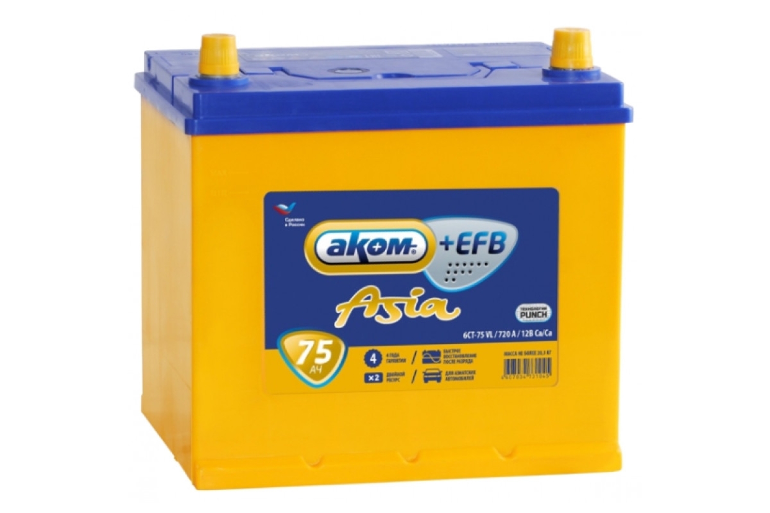 Аккумулятор Аком Asia EFB 75 обр. пол. — технические характеристики